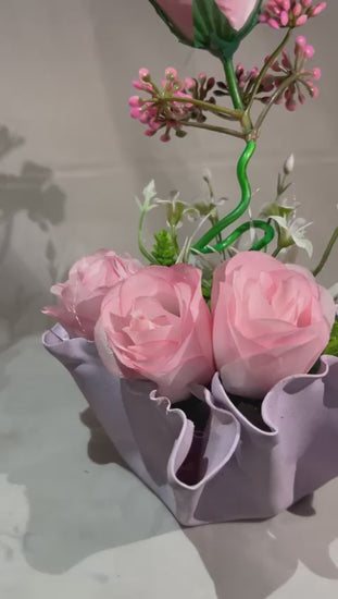 A purple colour designer foam base, assembled with 4 rose flowers and lots of fillers